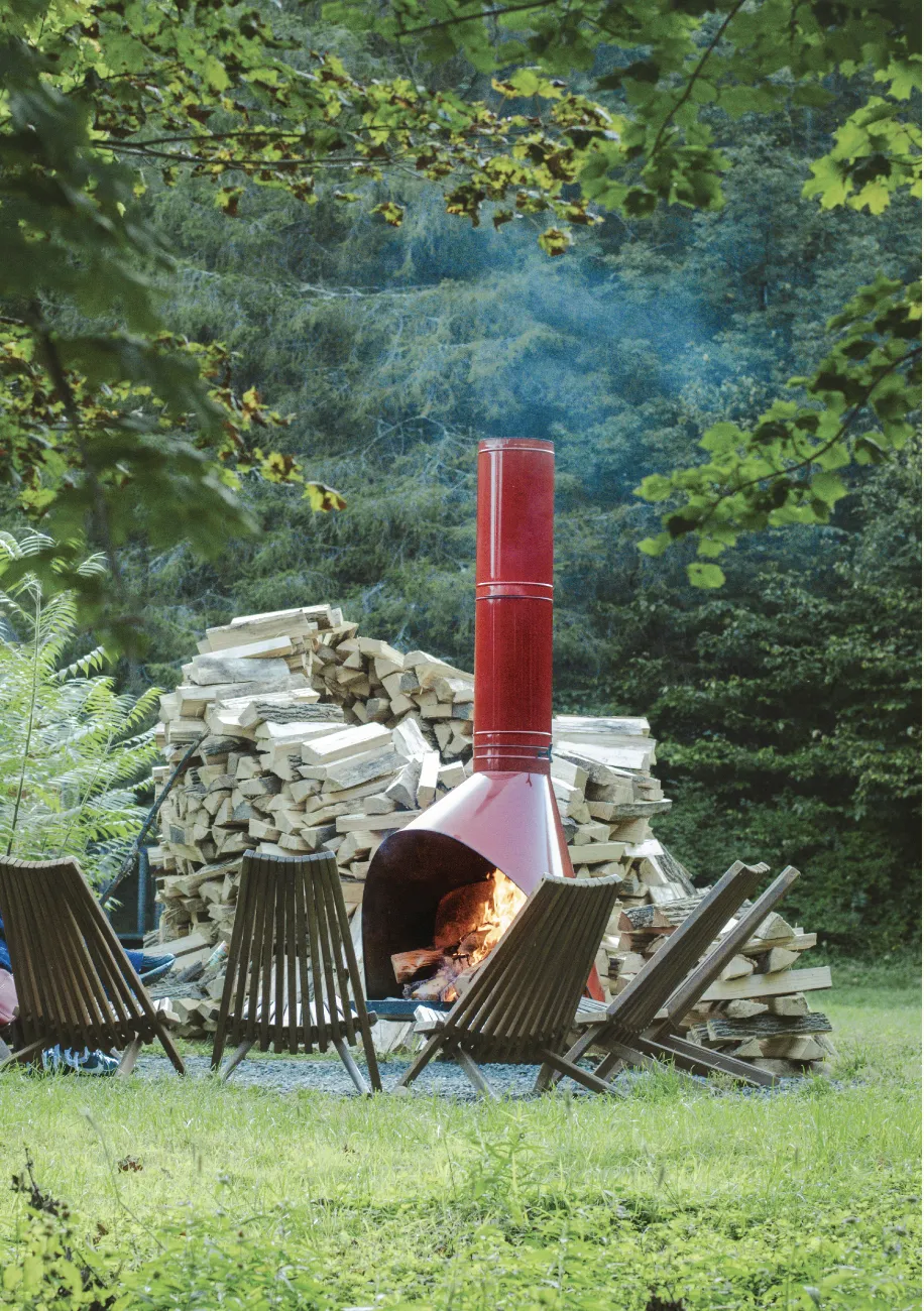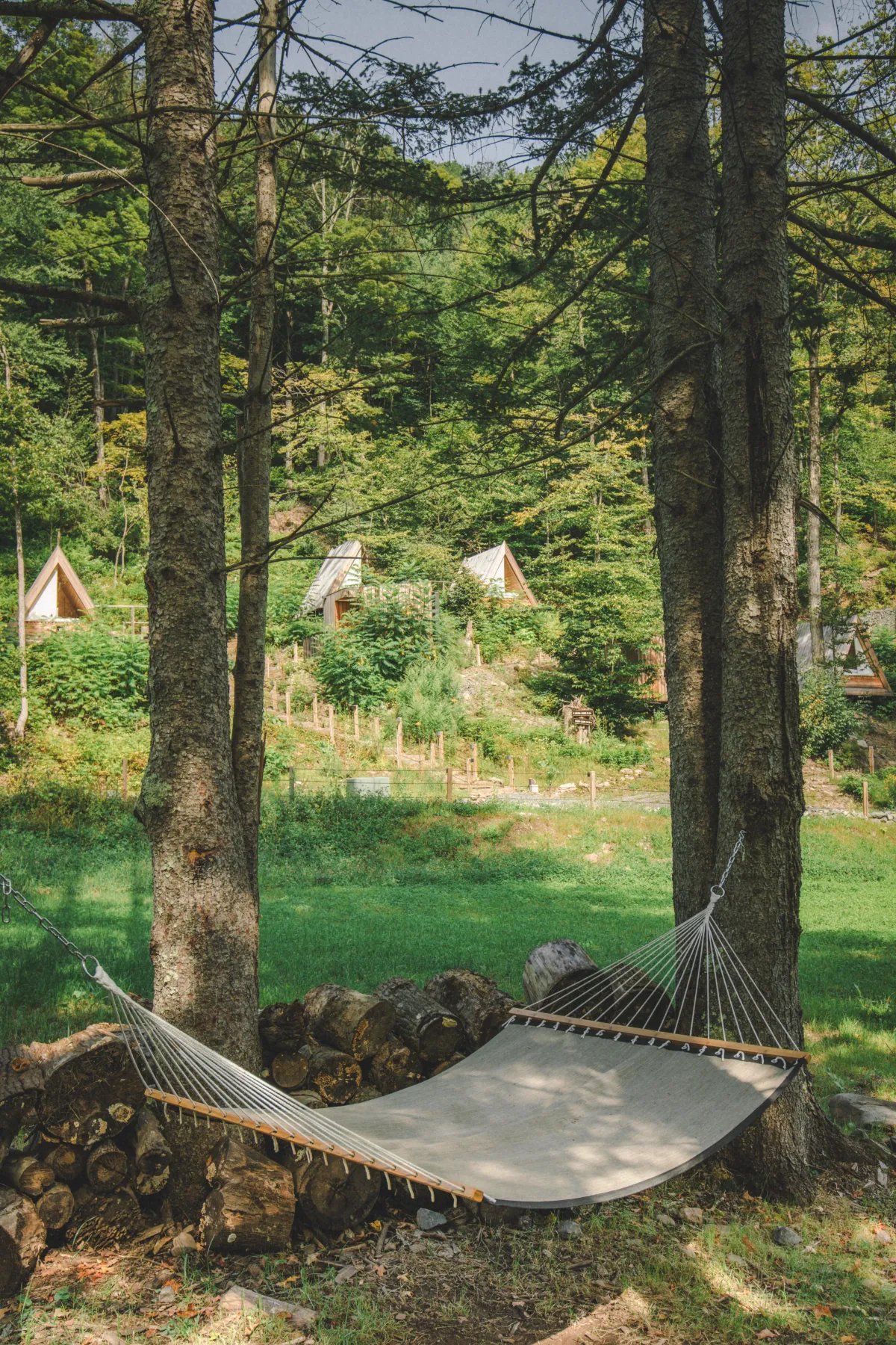 Amenities include a wood-framed sauna, hammocks, pool, fire pits, hiking trails, and complimentary bikes.