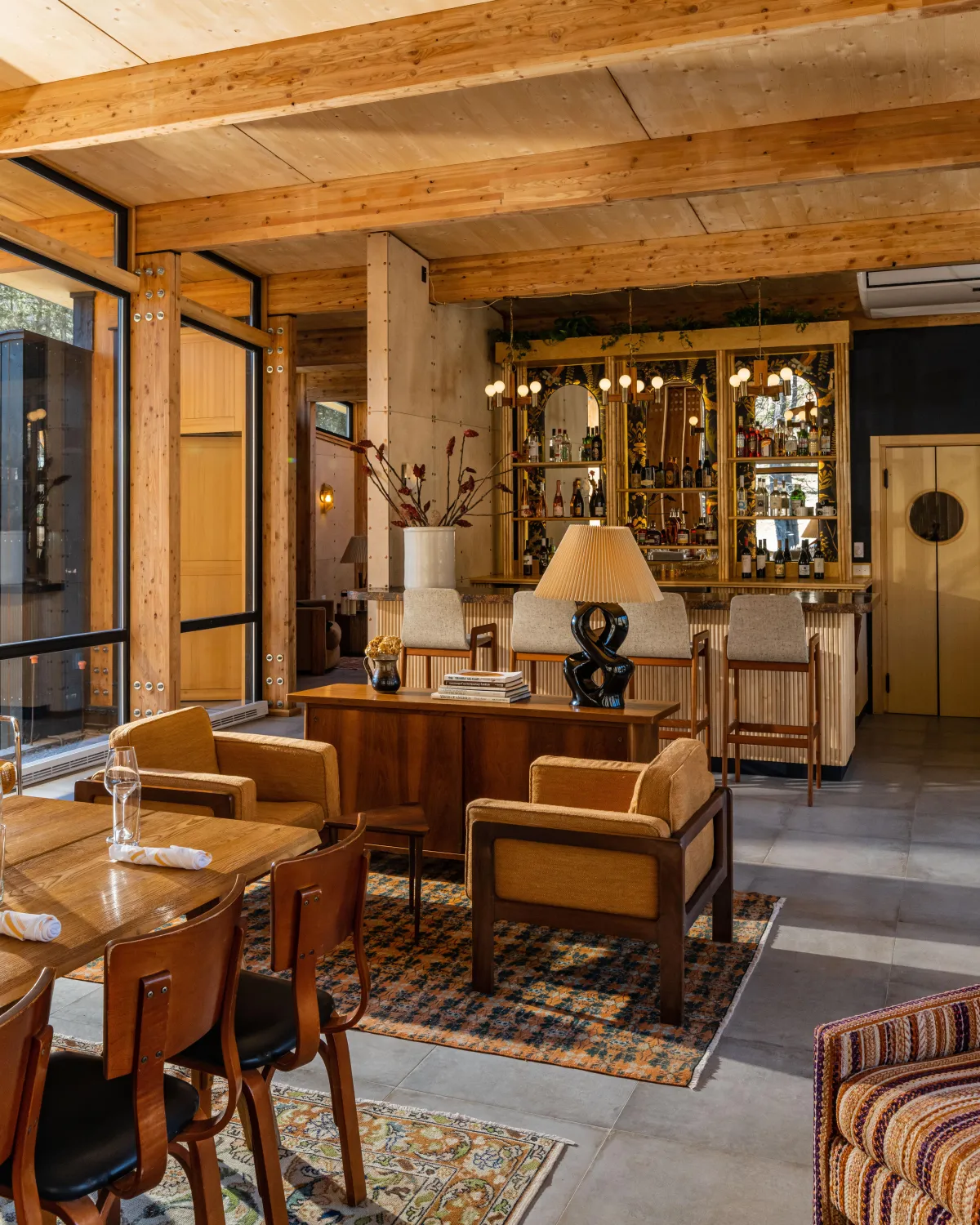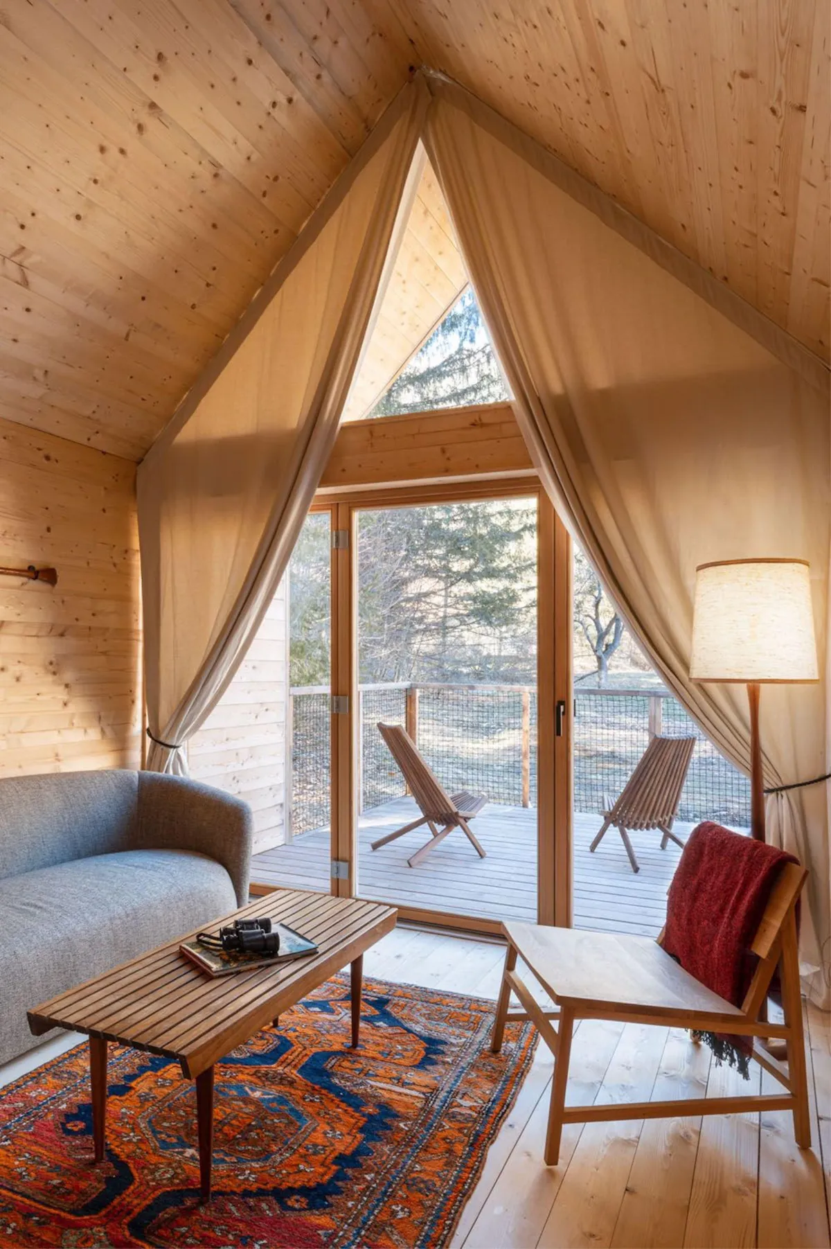 The property features 26 unique accommodations, which range from cozy single cabins to larger suites with outdoor decks. The design emphasizes minimalist Scandinavian and cozy mid-century touches.